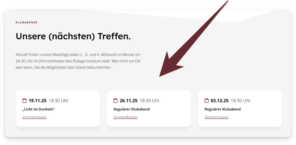 Mit der neuen Seite könnt ihr jetzt ganz leicht die nächsten Klubtreffen synchronisieren! Also, keiner mehr, der sich über verpasste Termine beschwert – Hurra! 🎊