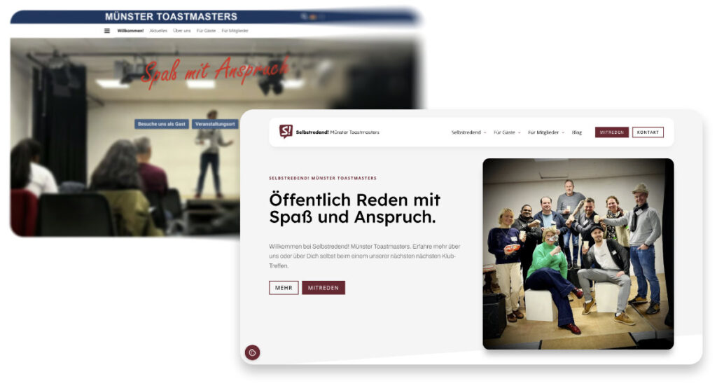 Die erste Sache, die euch ins Auge springen wird, ist unser neues, modernes Design. Weiß, Schwarz und ein tiefes Weinrot – der neue Look in Anlehnung an die Toastmasters International Marke. Ein bisschen elegant, ein bisschen verspielt.